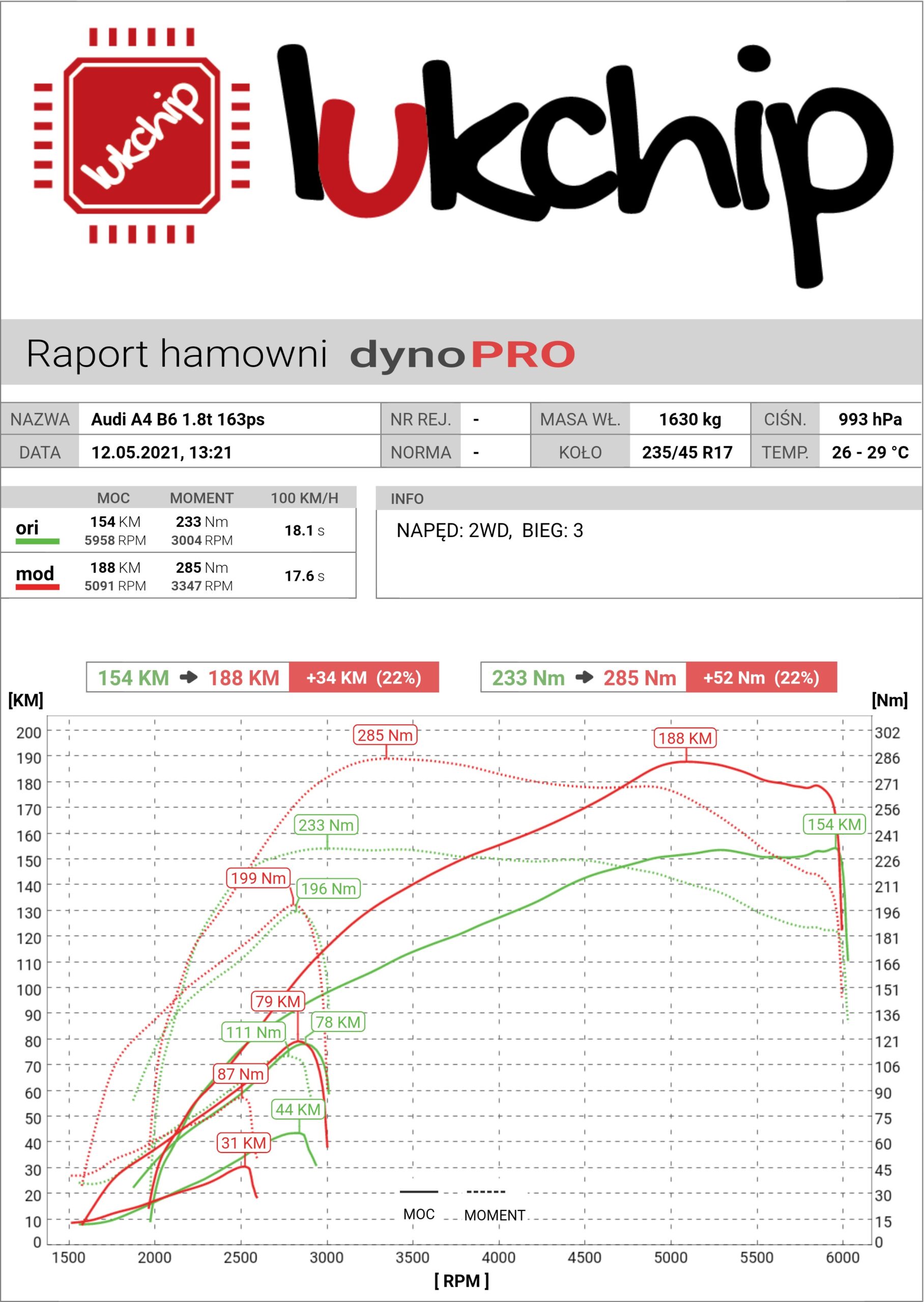 Przed modyfikacją : moc 154 KM – moment 233 NM